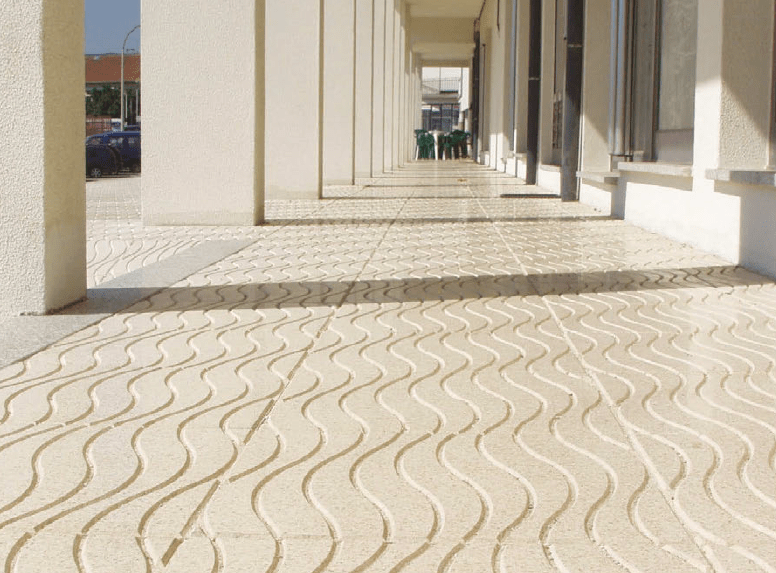 Lajeta de betão para pavimentos exteriores, de superfície imitação de relevo polido, ideal para praças, passeios, caminhos, terraços e pátios, conciliando o relevo decorativo com a facilidade de manutenção